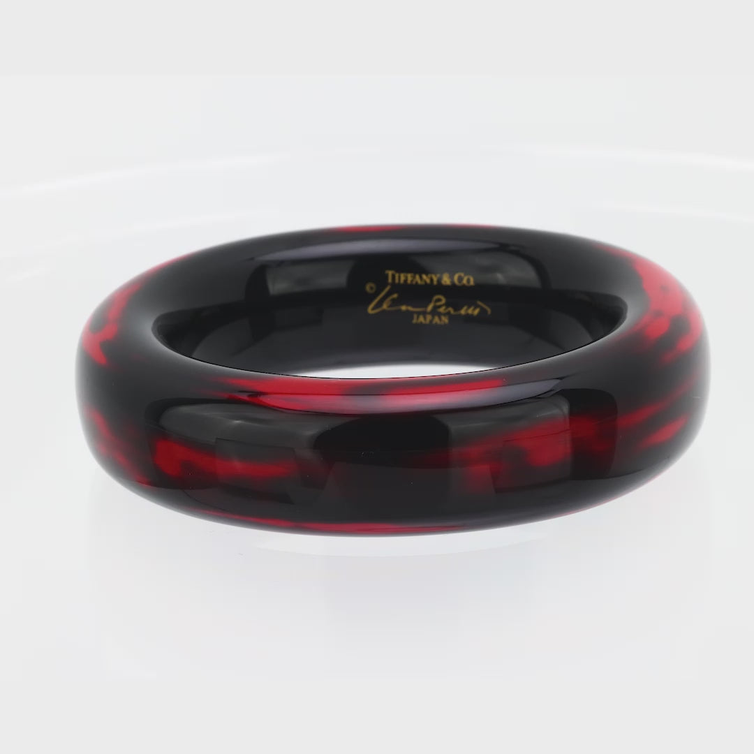 An eye-catching bangle from Elsa Peretti for Tiffany & Co.! Made of bright red and black lacquer over Japanese hardwood, this substantial cuff is both marvelous and unique! The red and black lacquer hues blend together seamlessly and resemble marble. The inside of the bangle features the Tiffany & Co. and Elsa Peretti signatures and is marked "JAPAN". A wonderful bangle, this piece would be perfect for a special occasion!